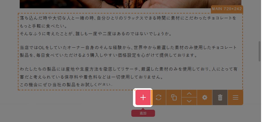 追加したい箇所の上にあるコンテンツパーツの上にマウスを合わせます。