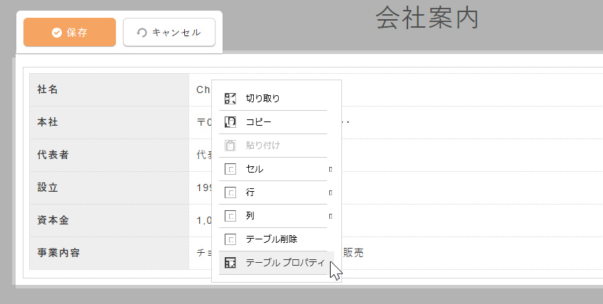 編集画面で、編集したいテーブルの上で右クリックをして、ショートカットメニューを表示させて、[テーブルプロパティ]をクリックします。