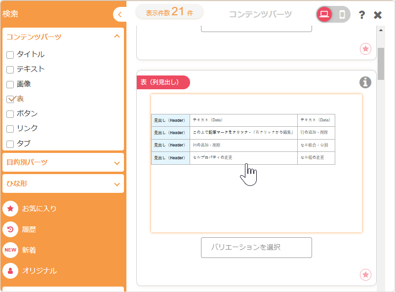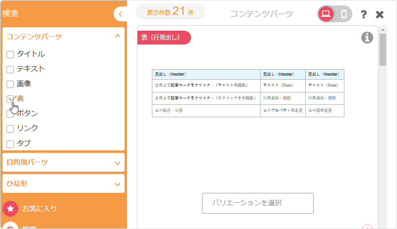 テーブル(表)を使用したコンテンツパーツの一覧から使用したいパーツをクリックすると、選択したコンテンツパーツが配置されます。