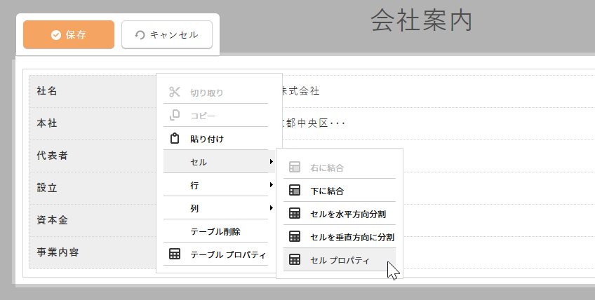 設定を変更したいセル内で右クリックをし、表示されるショートカットメニューから[セル][セルプロパティ]をクリックします。