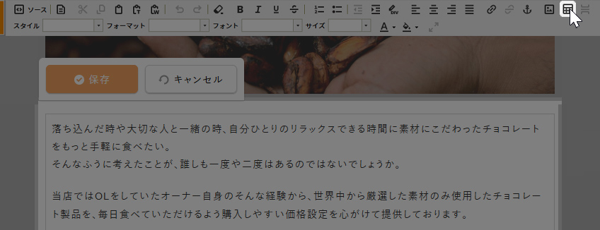 編集画面で、テーブル(表)を挿入したい位置にカーソルを置き、ツールバーの[テーブル挿入/編集]ボタンをクリックします。ダイレクト編集の場合、編集する箇所によってはツールバーに[テーブル挿入/編集]ボタンが表示されないこともあります。その場合は、フルエディタ編集に切り替えて作業を行ってください。