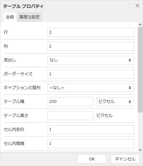 行、列 テーブルの行数と列数を設定します。作成後に変更することも可能です。