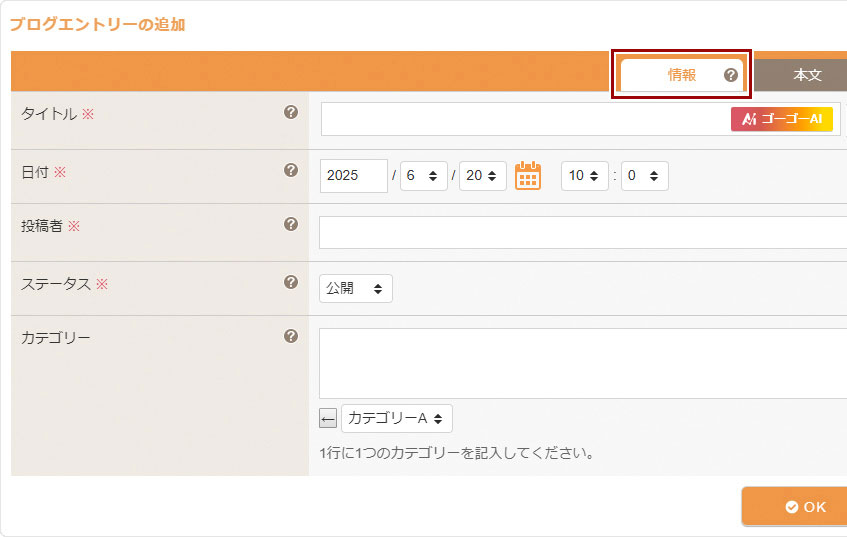 ブログエントリー【情報】タブ内の《タイトル》にエントリーのタイトルを入力し、《カテゴリー》にブログのカテゴリーを登録します。