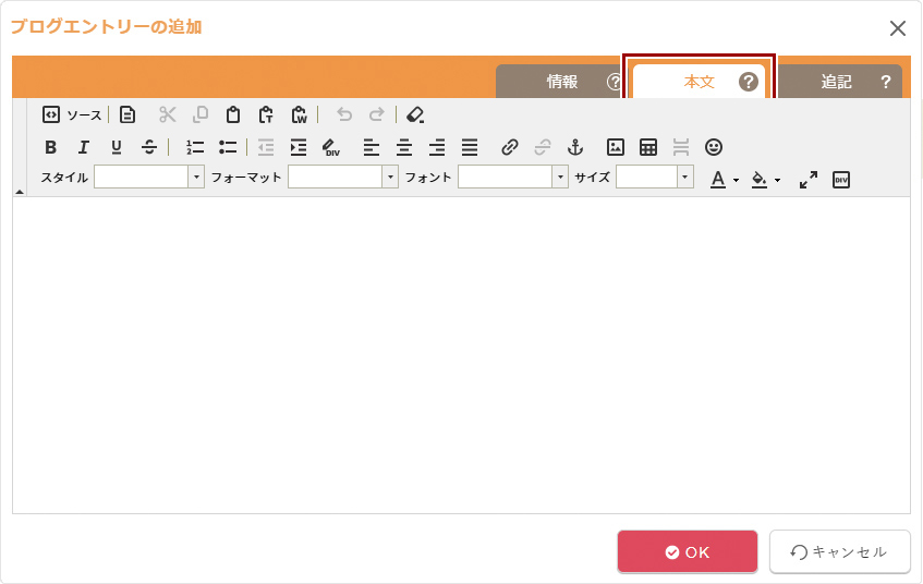 【本文】タブを選択し、エントリーの本文を入力して[OK]ボタンを選択します。