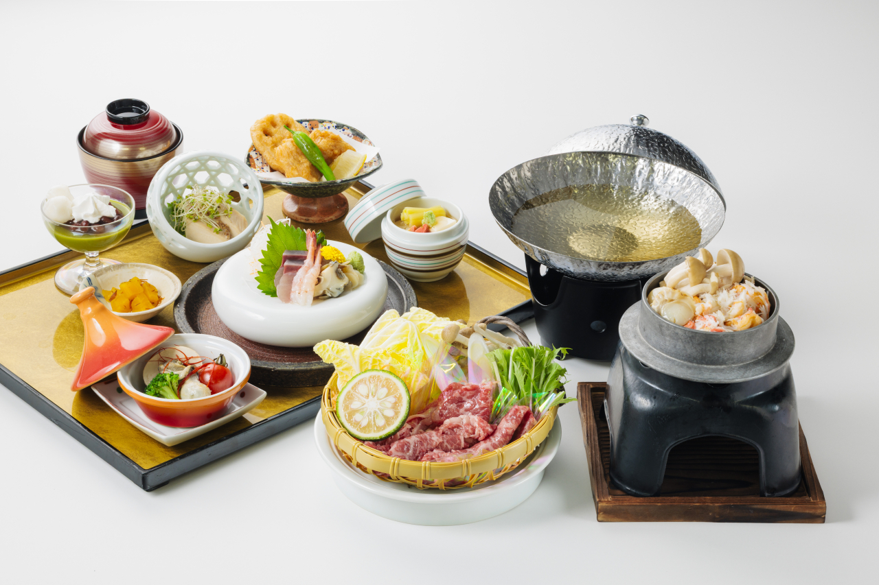 お造りの新鮮な旨み、岡山県産奈義牛を使用した柚子風味鍋や、カニ・帆立の釜めしなど、見た目にも華やかな御膳が、冬のひとときを上品に彩ります。