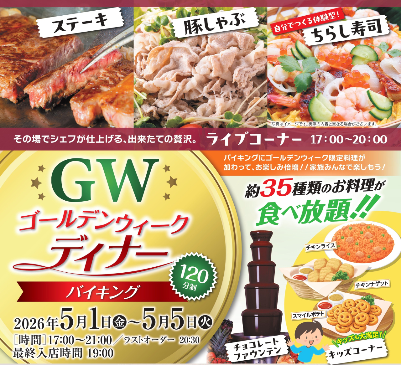 ゴールデンウィーク期間限定で、特別なディナーバイキングを開催いたします。
